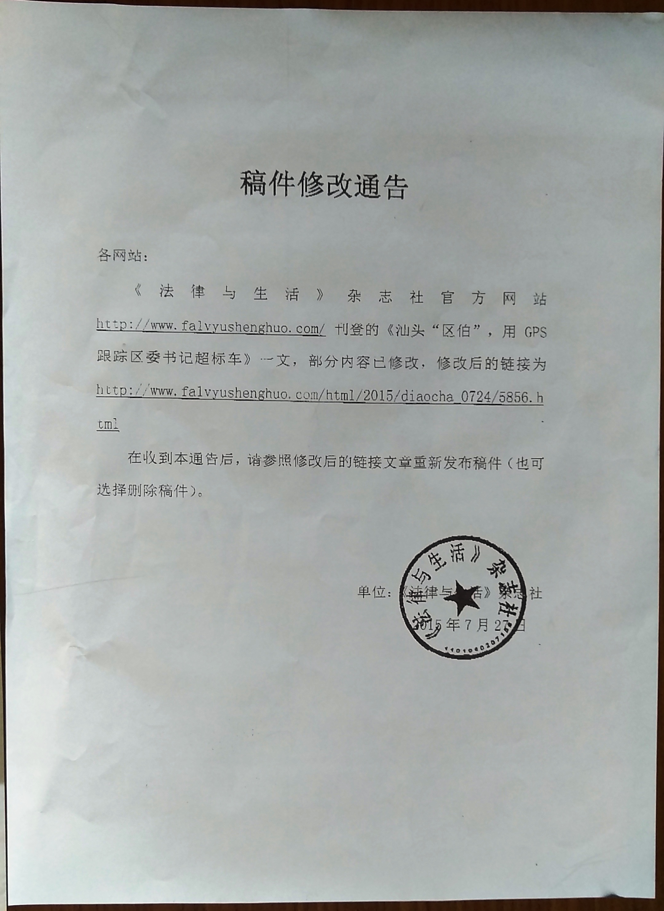 經(jīng)嚴(yán)正交涉,相關(guān)雜志已及時修改相關(guān)稿件,并向各網(wǎng)站發(fā)出《稿件修改通知》(見附件),望各相關(guān)網(wǎng)站及時刪除不實內(nèi)容稿件,不再轉(zhuǎn)載傳播相關(guān)不實內(nèi)容,以免對當(dāng)事人造成進一步傷害,否則我所將根據(jù)授權(quán)采取措施追究其法律責(zé)任。