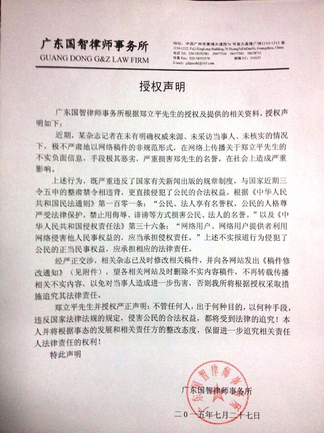 廣東國智律師事務(wù)所根據(jù)鄭立平先生的授權(quán)及提供的相關(guān)資料,授權(quán)聲明如下: