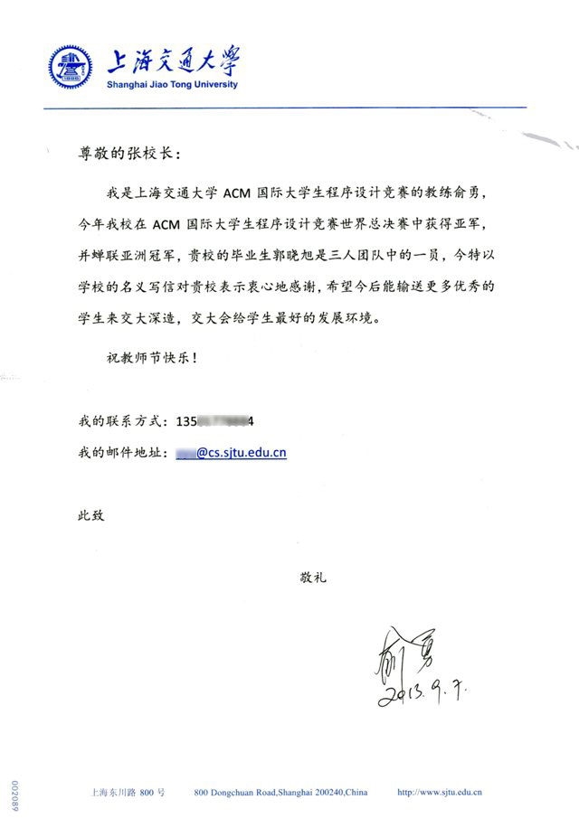 特此喜報! ![]() 上海交通大學副校長徐學敏發(fā)來感謝信 ![]() 上海交通大學ACM國際大學生程序設計競賽教練俞勇發(fā)來感謝信 |