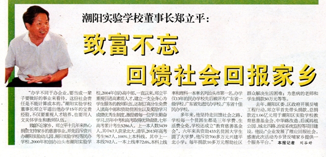 致富不忘回饋社會回報家鄉(xiāng)——《汕頭日報》報道鄭立平董事長回饋社會事跡