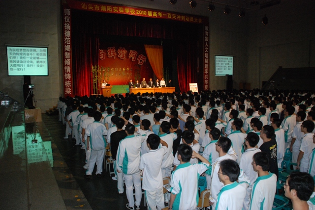 2010年2月26日晚上19:20,潮陽實(shí)驗(yàn)學(xué)校高中部在體育館召開高三年級(jí)高考百日動(dòng)員大會(huì),大會(huì)在貝多芬雄壯的命運(yùn)交響曲中如期進(jìn)行,標(biāo)志著學(xué)生進(jìn)入了高考最后的沖刺階段。學(xué)�?傂垙�(fù)昌校長、總校副校長林少強(qiáng)校長、高中部副校長楊啟富校長、教務(wù)處張世平主任、政教處鄭楚堅(jiān)主任、高三年級(jí)級(jí)長譚承俊老師出席會(huì)議。
