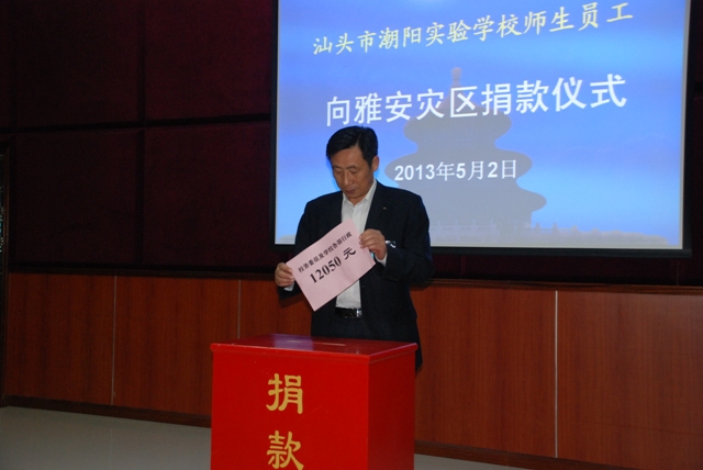 2013年4月20日上午8時(shí)02分,四川省雅安市蘆山縣發(fā)生7.0級(jí)地震,災(zāi)情嚴(yán)重,牽動(dòng)所有中國(guó)人的心。“一方有難、八方支援”是中華兒女優(yōu)良傳統(tǒng),也是我們潮陽(yáng)實(shí)驗(yàn)學(xué)校優(yōu)良傳統(tǒng)。當(dāng)四川雅安災(zāi)情發(fā)生后,學(xué)校領(lǐng)導(dǎo)立刻召開(kāi)了專(zhuān)題會(huì)議,研究部置向?yàn)?zāi)區(qū)捐款獻(xiàn)愛(ài)心活動(dòng),號(hào)召全體教職員工和同學(xué),伸出援助之手,奉獻(xiàn)一片愛(ài)心,為災(zāi)區(qū)同胞戰(zhàn)勝自然災(zāi)害,早日重建家園貢獻(xiàn)一份力量。該活動(dòng)得到了廣大教職員工和學(xué)生、學(xué)生家長(zhǎng)的大力支持,在學(xué)校副校長(zhǎng)、高中部負(fù)責(zé)人張復(fù)昌的帶動(dòng)下,師生慷慨解囊、涌躍捐款,充分體現(xiàn)潮實(shí)人的大愛(ài)和善良,為災(zāi)區(qū)群眾送上一份溫暖。