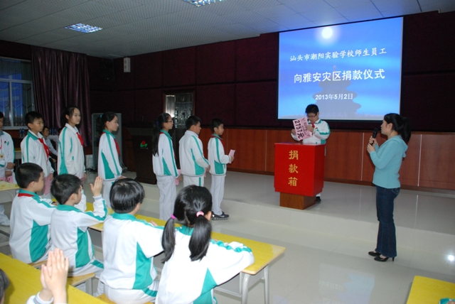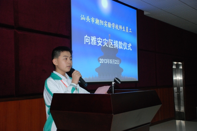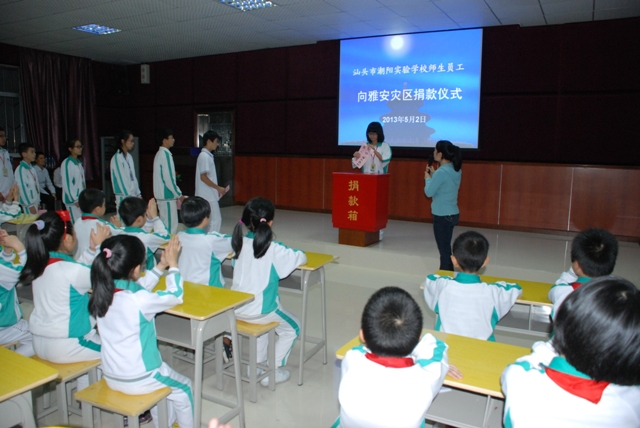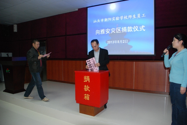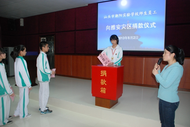 2013年5月2日晚上6點(diǎn)40分,潮陽(yáng)實(shí)驗(yàn)學(xué)校教職員工和學(xué)生在初中部多功能廳為四川雅安災(zāi)區(qū)舉行了簡(jiǎn)樸而隆重的捐款儀式。參加活動(dòng)的有學(xué)校全體校務(wù)委員、各學(xué)部政教處主任、年級(jí)組長(zhǎng)、各學(xué)部每班一位學(xué)生代表。儀式由學(xué)校團(tuán)委書(shū)記鄭楚堅(jiān)主持,學(xué)校黨支部副書(shū)記張杰檳發(fā)表講話,初中一年級(jí)12班陳旭正同學(xué)代表全體同學(xué)發(fā)言。涓涓細(xì)水,匯集成流,本次活動(dòng)共收到師生捐款人民幣共482389.9元+港幣100元+澳元45元。