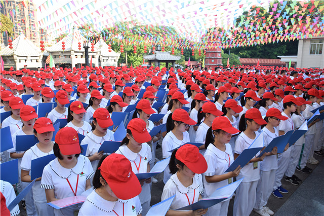 金秋颯爽,云高風(fēng)清,東山峰秀,碧樹葳蕤。800多名頭戴紅帽,手捧《論語》的學(xué)生,在莊嚴(yán)雄偉的孔廟大成殿前聲情并茂地齊誦《論語》。