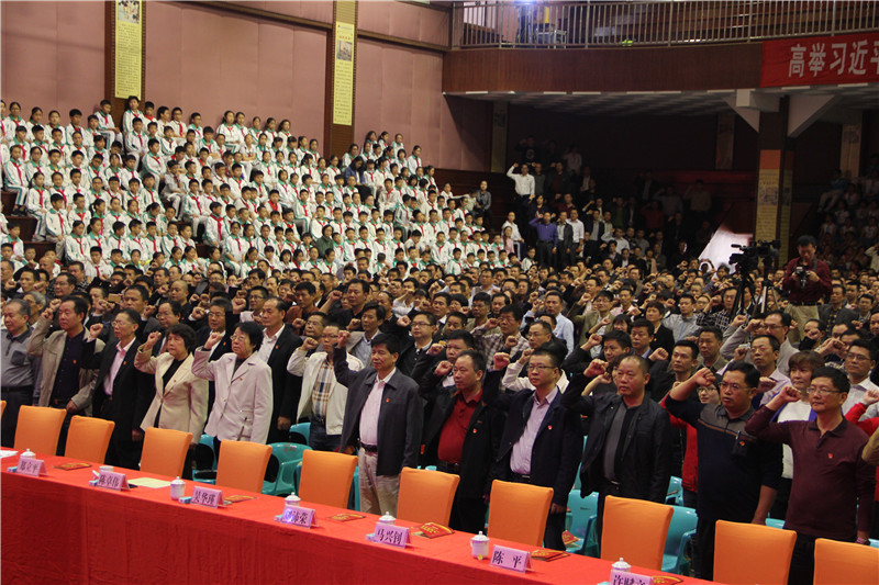 接著,潮陽區(qū)教育局黨組書記、局長(zhǎng)吳華瑾同志帶領(lǐng)蒞臨大會(huì)的黨員代表重溫入黨誓詞,帶領(lǐng)黨員代表在主席臺(tái)上面對(duì)黨旗莊嚴(yán)宣誓,鏗鏘有力、堅(jiān)定高昂的聲音回蕩激越,振奮人心:“我志愿加入中國共產(chǎn)黨,擁護(hù)黨的綱領(lǐng)……”。緊接著,全體人員高唱《沒有共產(chǎn)黨就沒有新中國》歌曲。