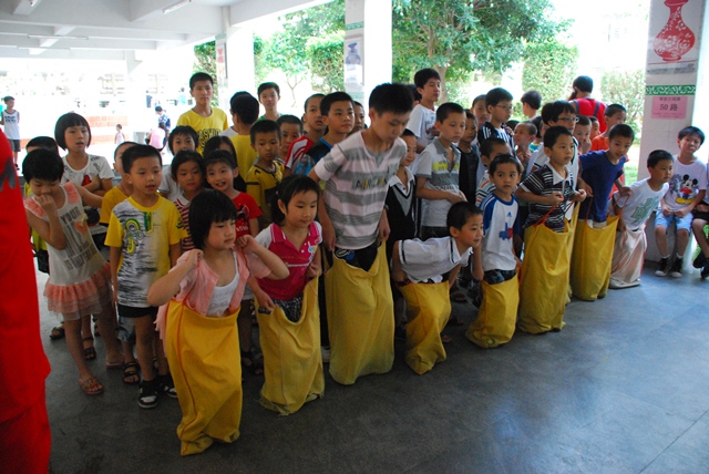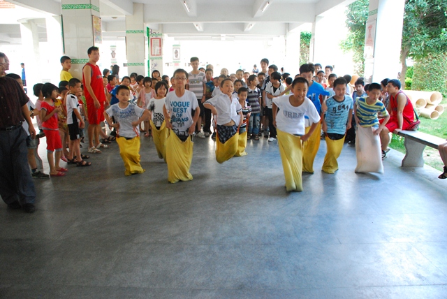 一個小袋袋,一只只“小袋鼠”,一串串歡笑!這就是我們夏令營的一個特別受營員們喜歡的游戲――跳跳樂。每天下午一到游戲時間,營員們就排著長長的隊伍在一樓大廳等著,盼著。在指導老師和連長的指導下,營員們進行著小組對抗賽。你瞧,他們拼命地奔著,跳著,為了榮譽,享受快樂,即使摔了,也全然不顧,爬起來繼續(xù)奔……