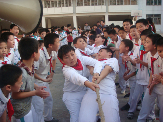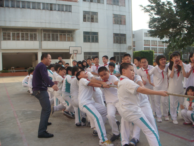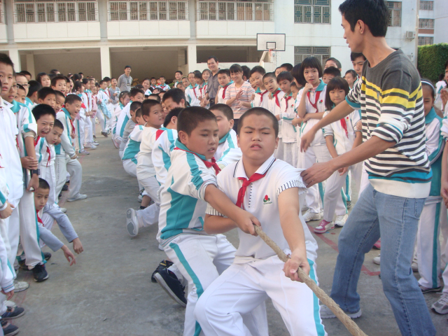 “加油、加油、加油、加油••••••”為豐富學(xué)生的課余文化生活,增強(qiáng)集體凝聚力,發(fā)揚(yáng)團(tuán)隊(duì)精神,提高鍛煉意識(shí),本學(xué)期五年級(jí)組利用13周到14周周一下午的第七節(jié)課在小學(xué)部操場(chǎng)舉行了激動(dòng)人心的班級(jí)拔河比賽。在年級(jí)組全體老師的精心組織下,一場(chǎng)場(chǎng)比賽終于拉開(kāi)了序幕,操場(chǎng)沸騰了!場(chǎng)場(chǎng)比賽雙方隊(duì)員都緊緊抓牢手中的繩子,下腰勒繩,重心降低,齊心協(xié)力往后拉,圍得水泄不通的啦啦隊(duì)也都在場(chǎng)有節(jié)奏的吶喊助威,給足了隊(duì)員們信心。選手們更是咬緊牙關(guān),使盡全力,奮勇拼搏。每一支參賽隊(duì),每一個(gè)隊(duì)員都全力以赴,賽出了頑強(qiáng)的精神、團(tuán)結(jié)的風(fēng)尚!場(chǎng)場(chǎng)比賽牽動(dòng)著師生們的心,班主任、在場(chǎng)的老師紛紛在旁邊加油助威,吶喊聲中,師生們?nèi)跒橐黄瑤熒男馁N得更緊了,助威聲、吶喊聲與參賽隊(duì)員拼搏的身影融為一體,將比賽一次次推向高潮。賽場(chǎng)上,師生們用自己獨(dú)有的方式詮釋著一個(gè)共同的詞語(yǔ)——團(tuán)結(jié)。這樣的團(tuán)體活動(dòng)不僅增強(qiáng)了班級(jí)的凝聚力,發(fā)揚(yáng)了團(tuán)隊(duì)精神,更進(jìn)一步激發(fā)了同學(xué)們參與體育健身的積極性。