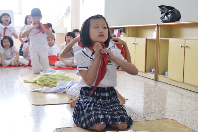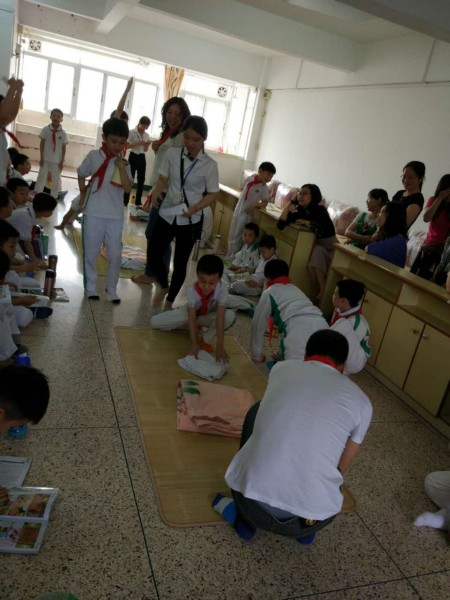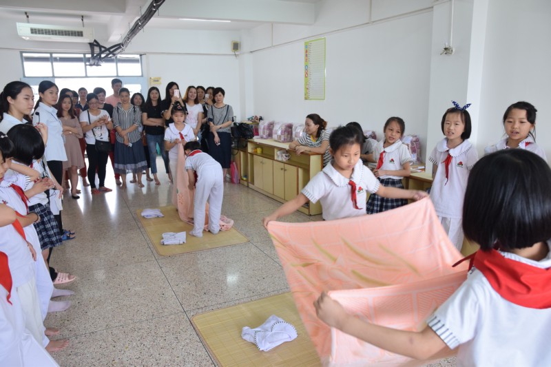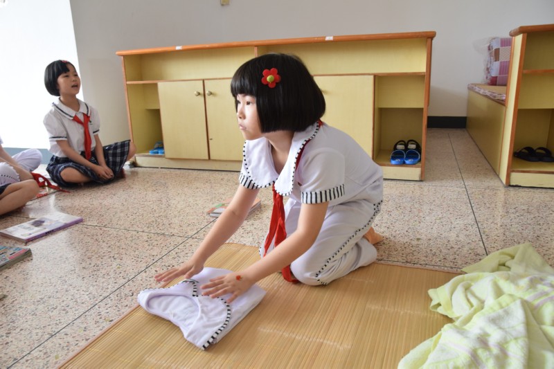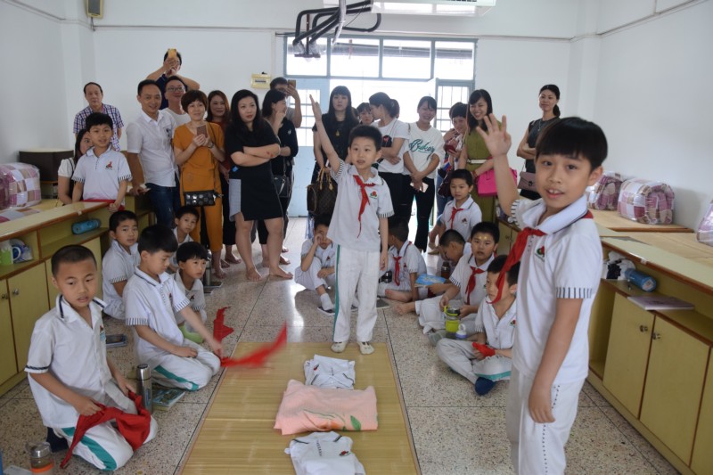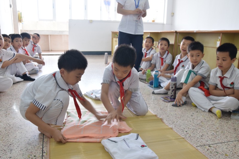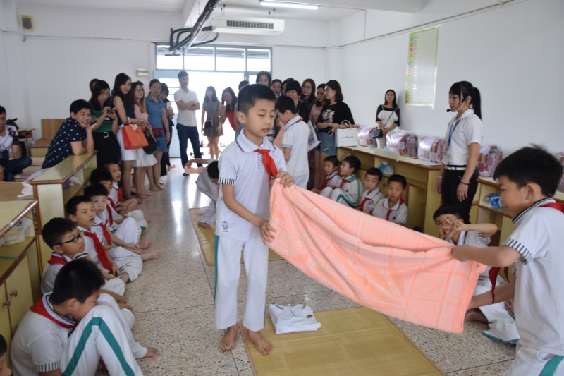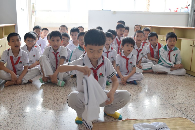 本次活動以班級寢室為單位,比賽形式為:學(xué)生兩人一小組,依次完成解戴紅領(lǐng)巾、疊校服一套、兩生合作完成疊被單,先完成的組舉手示意,再由生活老師簡單點評,比賽結(jié)束后頒發(fā)優(yōu)勝獎和紀(jì)念獎。