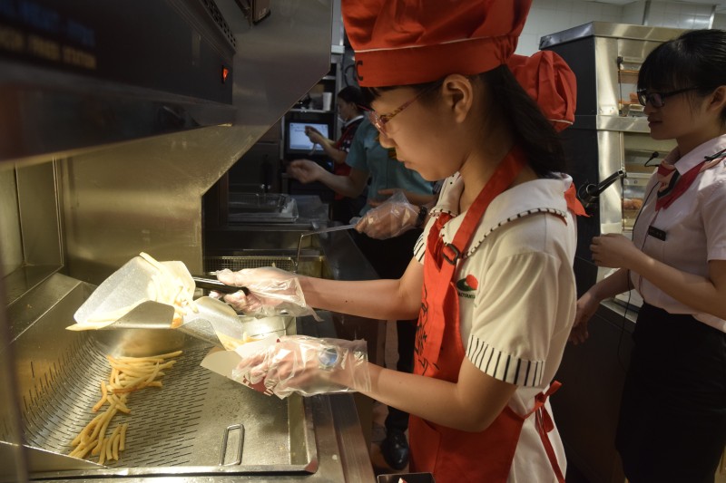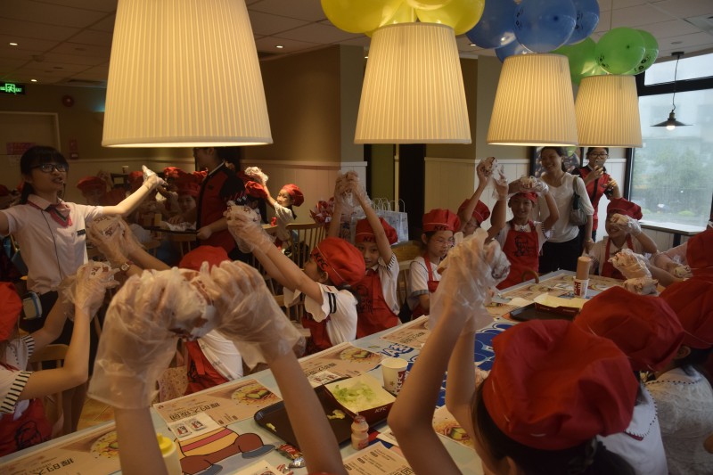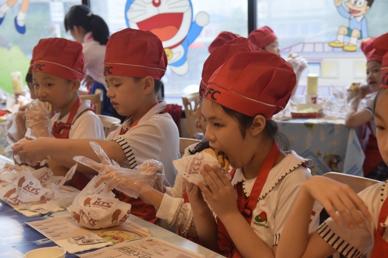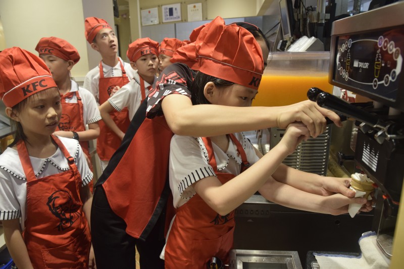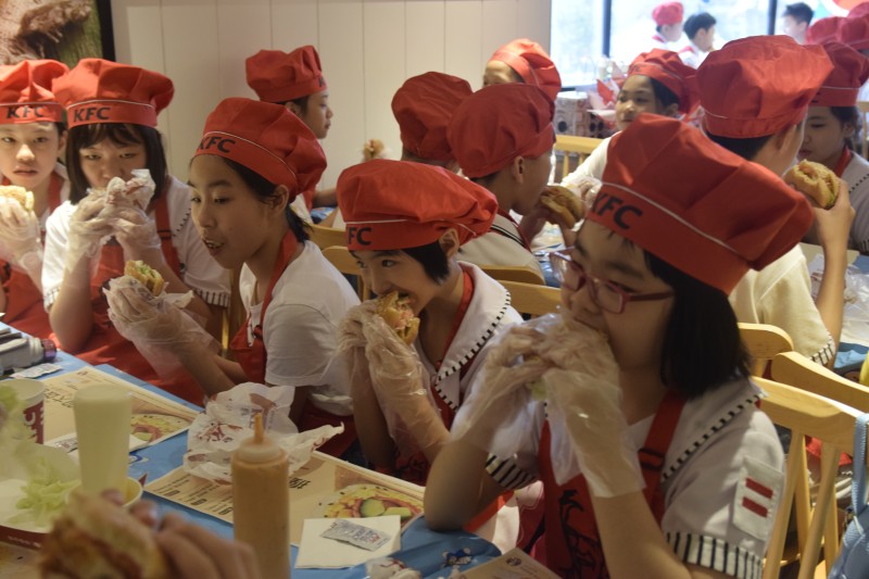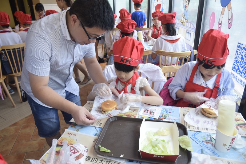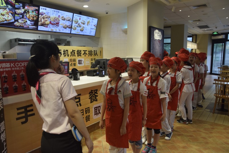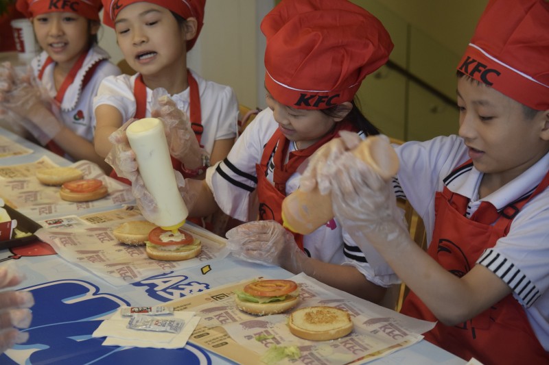 KFC的員工熱情地招待了我們,并為我們精心準備了服裝,以保證衛(wèi)生。一切就緒后,探秘之旅正式開始了。我們分成四個小分隊進入廚房,了解相關(guān)設(shè)備。令我們驚訝的是每一個新鮮出爐的漢堡,每一根金黃色的薯條,在交到顧客之前都經(jīng)過層層嚴謹、復雜的操作。最令人激動地環(huán)節(jié)來了,要學習制作漢堡了。在工作人員邊示范邊講解下,同學們一個個按照程序夾菜、涂醬、放雞塊……當把兩塊面包合在一起時,一個漢堡終于出爐了。同學們吃著自己親手做出來的漢堡,品嘗著自己親手灌裝的可樂,舉起自己親手制作的冰激凌,毫不掩飾的喜悅之情溢于言表。