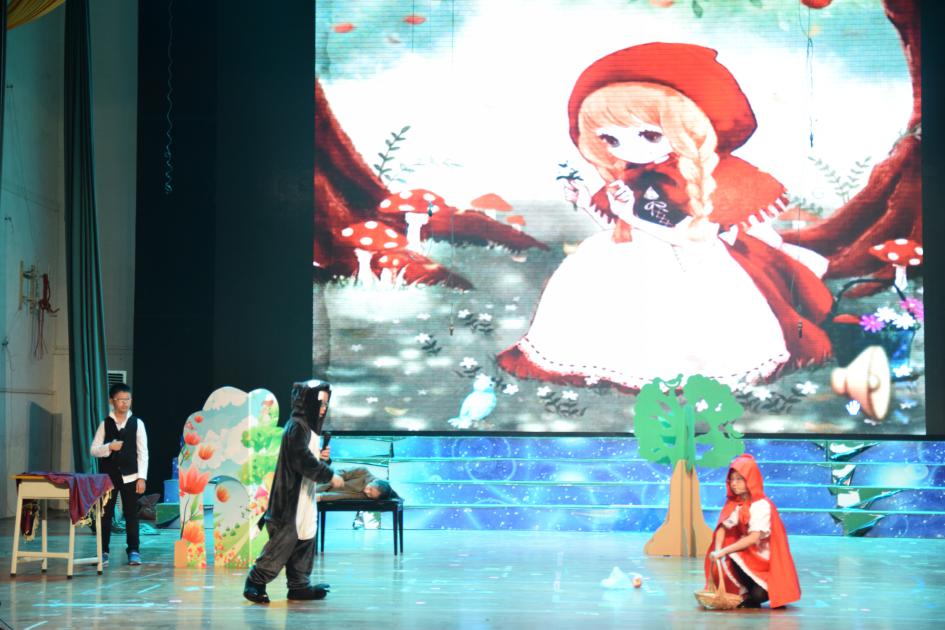 傳世經(jīng)典《小紅帽》,被再次詮釋。大灰狼的狡猾狠毒,小紅帽的天真無邪以及獵人的勇敢熱心,小演員們展現(xiàn)得淋漓盡致,還有那標(biāo)準(zhǔn)流利的英語旁白,無一不展現(xiàn)了學(xué)生們良好的英語素養(yǎng)。臺下觀眾掌聲陣陣,不絕于耳。