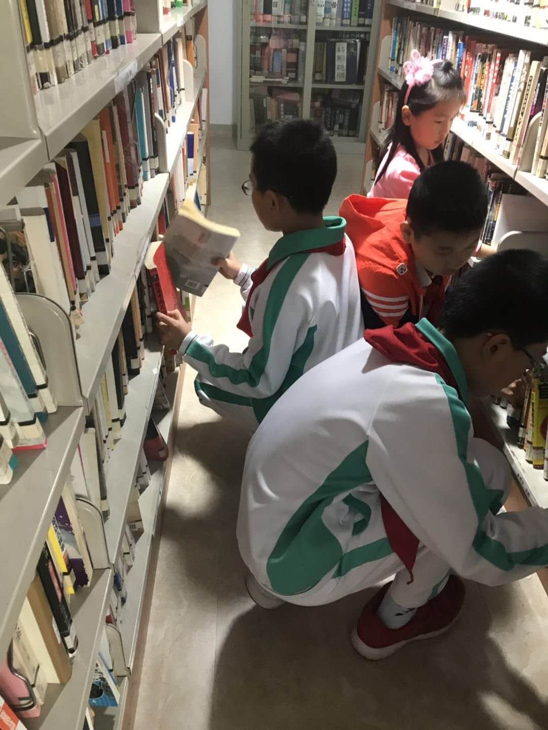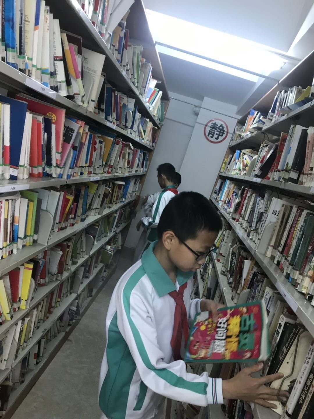 騰飛小隊(duì)的隊(duì)員們走進(jìn)圖書館,幫助管理員整理閱覽室書籍;