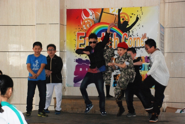 在政教處副主任胡丹的大力鼓勵(lì)下,學(xué)生們?nèi)呵榧ぐ�;在小主持人彭珊琪、陳瑞瀅的帶領(lǐng)下,大家喊出了本次“英語角”活動(dòng)的口號(hào):Read more, speak more, I’ m the best. (多讀、多說、我最棒!)在歡快動(dòng)感的旋律中,特邀506班嘉賓表演的《江南Style》,全場(chǎng)沸騰,熱舞high翻天。