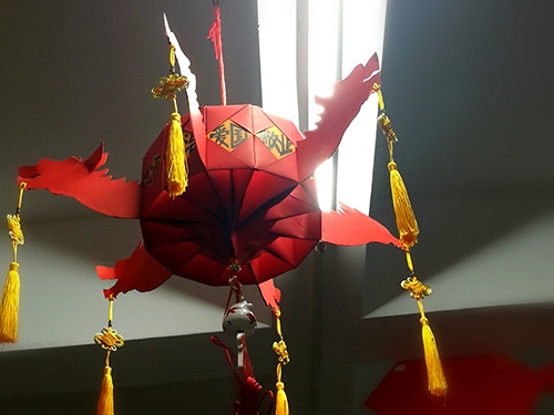 這是一盞用普通紅色卡紙制作的燈籠,其新穎別致的外觀奪人眼球,而且還將傳統(tǒng)文化與核心價值觀緊密結(jié)合。