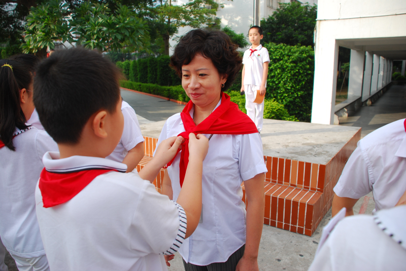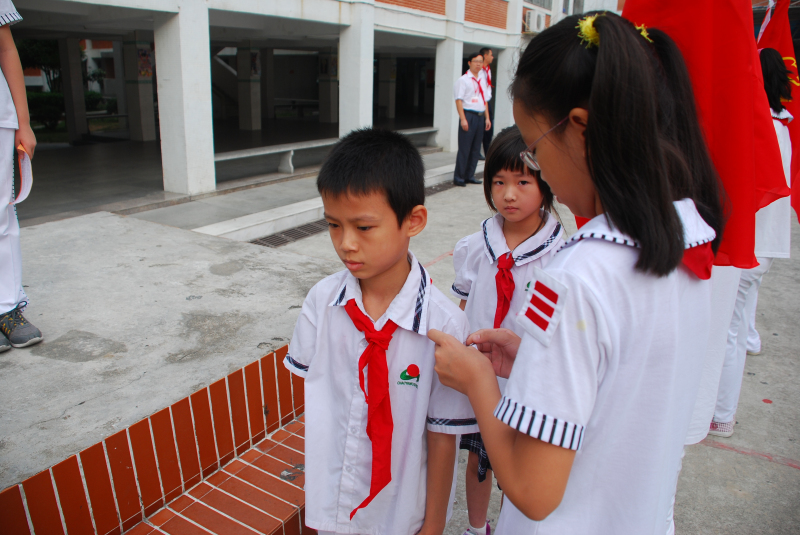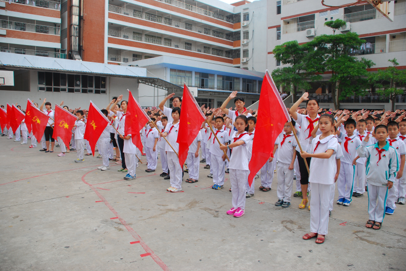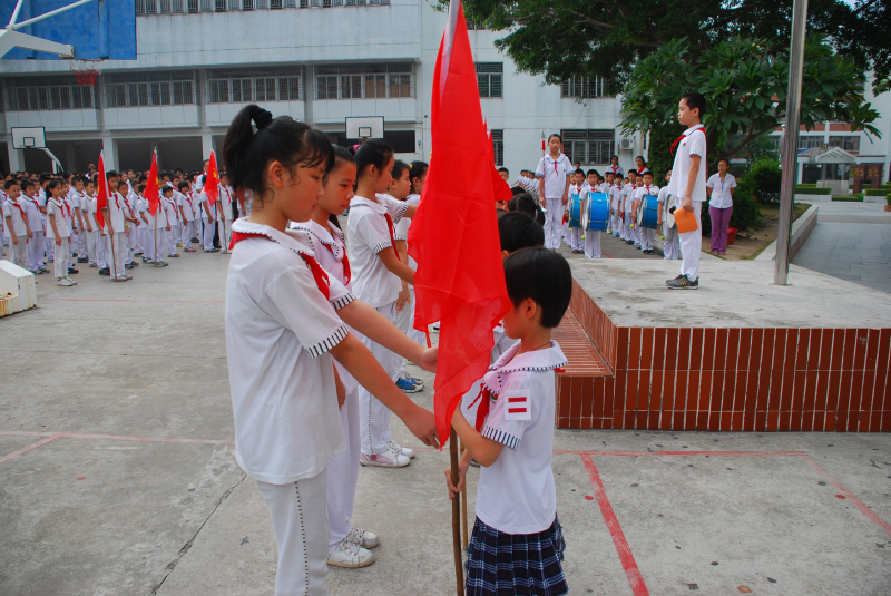為了增強少先隊員的光榮感和自豪感,引導隊員繼承和弘揚少先隊的光榮傳統(tǒng),2011年10月10日,汕頭市潮陽實驗學小學部在建隊節(jié)到來之際舉行了別開生面的升旗儀式,國旗飄飄、歌聲嘹亮。這次升旗儀式的主題是“我為隊旗添光彩”,在莊嚴地的五星紅旗下,分別舉行了低年級成立中隊以及中隊輔導員聘任儀式,當小隊長們左臂別上耀眼的兩道杠并執(zhí)著莊嚴的中隊旗時,當新聘輔導員手捧沉甸甸的聘書時,他們的臉上洋溢著燦爛的笑容,一如他們胸前鮮艷的紅領(lǐng)巾,同時也博得了同學們最熱烈的掌聲……