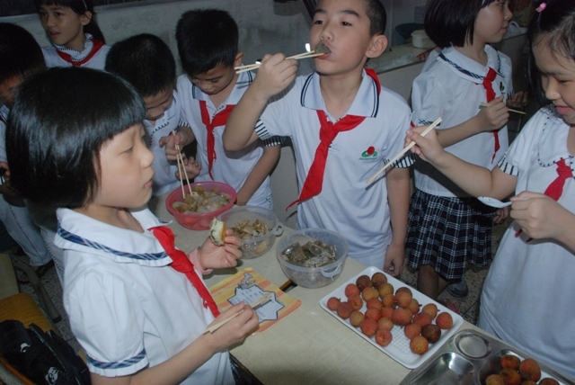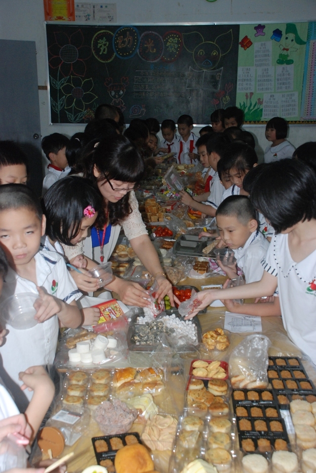 2013年5月27日下午,潮陽實(shí)驗(yàn)學(xué)校二年級(jí)組舉辦了一場別開生面的潮汕美食節(jié)活動(dòng)�;顒�(dòng)一開始便熱鬧非凡。首先是班級(jí)小組代表介紹自己小組周末收集的潮汕美食信息,展示“美食信息采集卡”,向同學(xué)們宣傳潮汕美食,教室里不時(shí)傳來一陣陣掌聲。接著是美食展覽,同學(xué)們紛紛拿出自己帶來的美食供同學(xué)們欣賞。不一會(huì)兒,乒乓粿、草粿、白果芋泥、蠔烙、達(dá)濠魚丸、菜頭粿、粽球、鱟粿、糯米豬腸、水晶餃、鼠殼粿、貴嶼餅等潮汕小吃就擺滿了一桌子。最后,同學(xué)們開始饕餮之旅,大快朵頤,現(xiàn)場充滿了歡樂的氣氛。