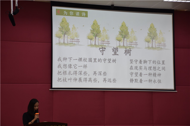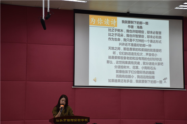此次讀書報告會分為三個部分,第一個部分是詩歌朗誦,劉彩霞、唐聲軍、張慧蓮、黃春平等四位老師為大家朗誦了他們假期閱讀的精彩選段,優(yōu)美的詩句加上老師們聲情并茂的演繹,讓大家沉醉其中。