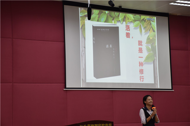 辛丹老師分享了余華的《活著》,她結合自身生活實際,暢談對生活的熱愛與堅持,感悟“活著就是一種修行”,明白“要在殘酷的生活中尋找生的希望”。分享完畢,五位老師為大家朗誦詩歌《讀書與修養(yǎng)—— 一同在路上》,點亮聽眾們閱讀的熱情。